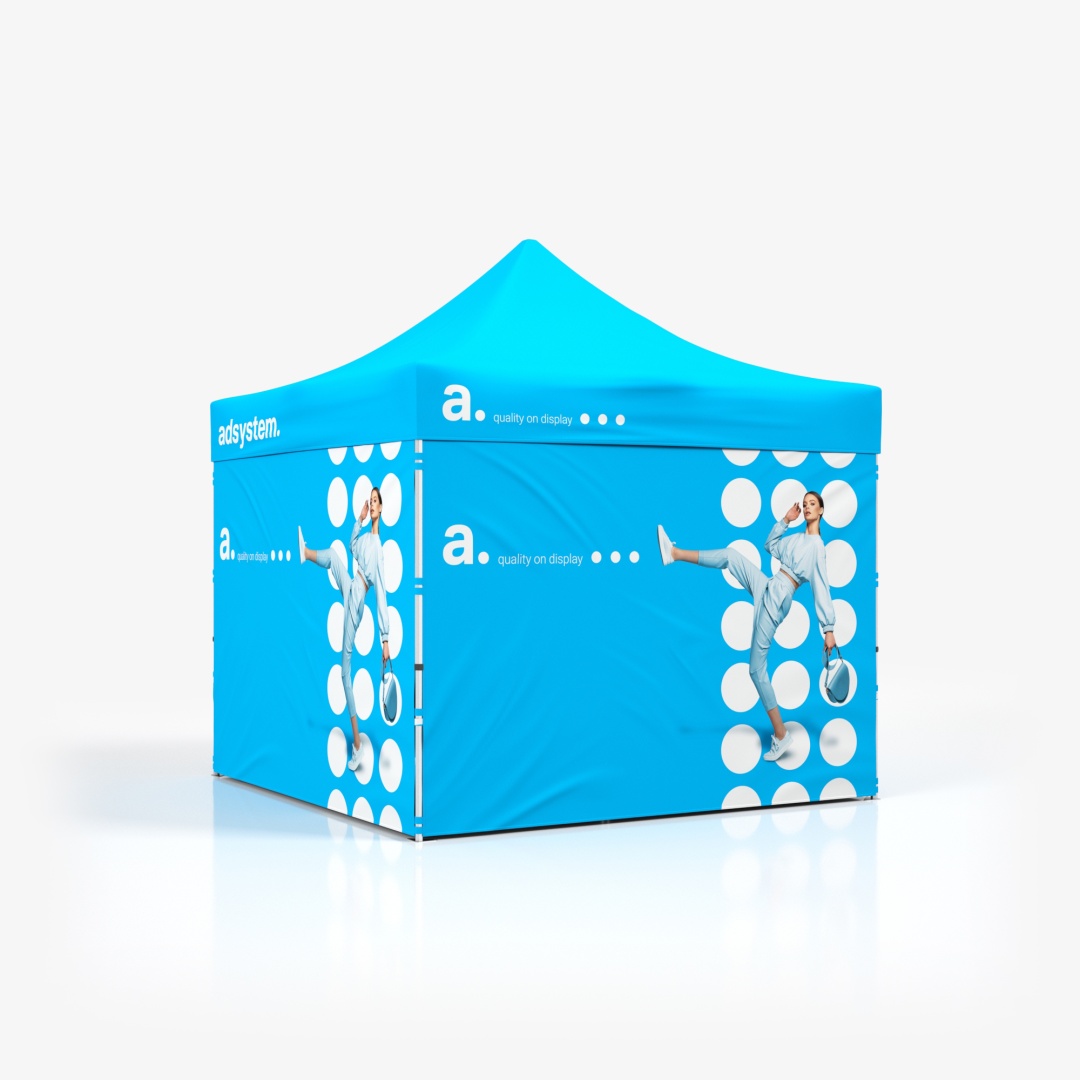 adTent Express è un gazebo pieghevole perfetto per eventi all’aperto o al chiuso. Protegge efficacemente lo stand dal sole e dalla pioggia, delimitando chiaramente lo spazio espositivo. La struttura è realizzata in alluminio leggero ma resistente, mentre il tetto utilizza un sistema a forbice pieghevole che permette un montaggio e uno smontaggio rapido e senza sforzo. Il set include anche una borsa morbida con ruote, che facilita il trasporto e la conservazione del gazebo.